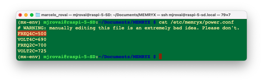 We can check it by the first field of the file, FREQ4. If the Raspberry Pi is set to the module’s default operating frequency (500 MHz), we should see FREQ4C=500, indicating that the module is set to a 500 MHz clock speed for 4-chip DFPs.
