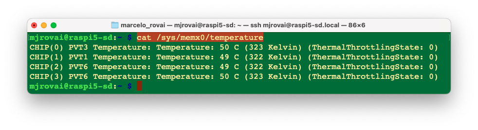 cat /sys/memx0/temperatureOr measurd continuay every 1 second, for example with the command: