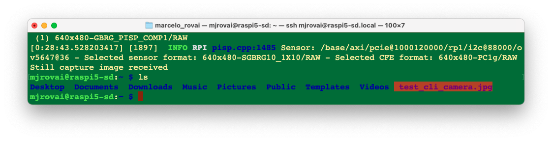 rpicam-jpeg --output test_cli_camera.jpg --width 640 --height 480To view the saved file, we should use ls, which lists the contents of the current directory: