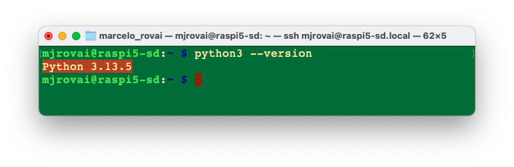 ssh mjrovai@rpi-5.local,ssh mjrovai@raspi.local, etc.:bash ssh username@hostname.localWhen you see the prompt:mjrovai@rpi-5:~ $It means you are interacting with your Raspberry Pi remotely.