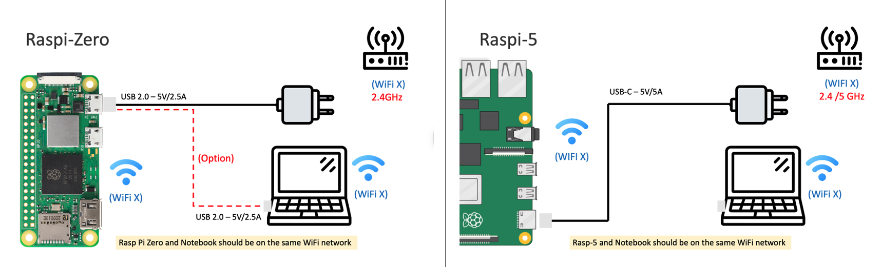 The Raspberry Pi and the notebook should be on the same WiFi network. Note that the Raspberry Pi 5 supports dual-band 802.11ac Wi-Fi (2.4 GHz and 5 GHz), whereas the Raspberry Pi Zero 2W supports only 2.4 GHz.