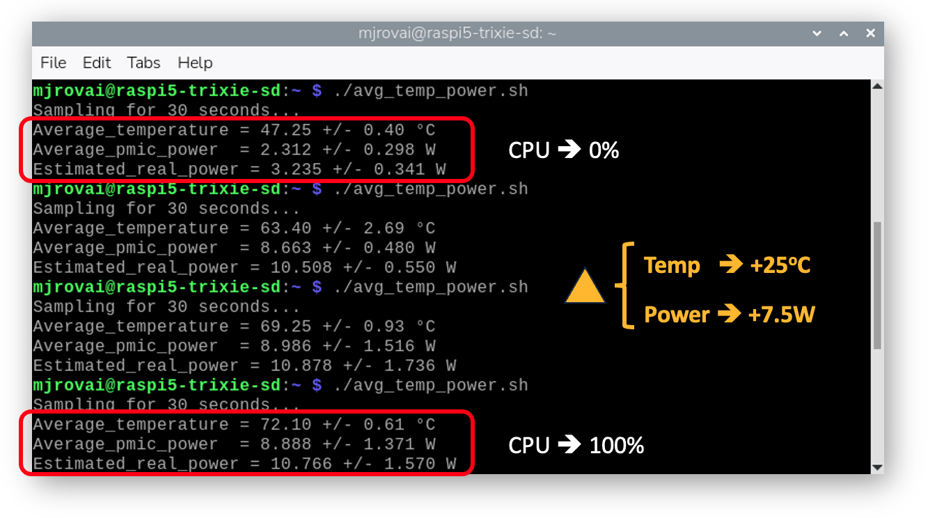 # Measure average CPU temperature and power on Raspberry Pi 5