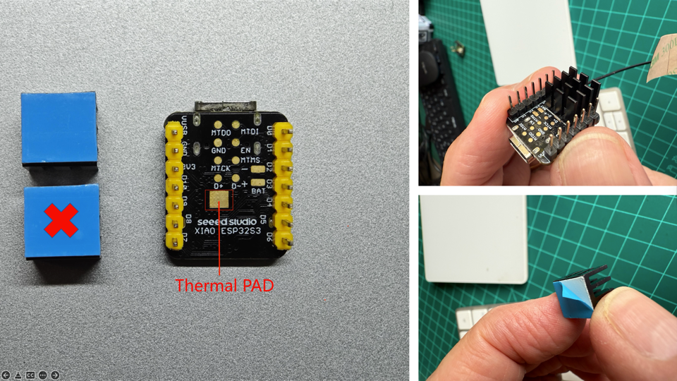 - Prioritize covering the Thermal PAD with the heat sink, as it is directly above the ESP32S3 chip, the primary source of heat. Proper alignment ensures optimal heat dissipation, and it is essential to keep the BAT pins as unobstructed as possible.