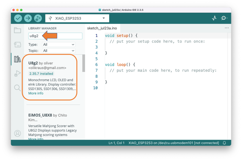 Books Icon).Enter u8g2 and select U8g2 by oliver. You can