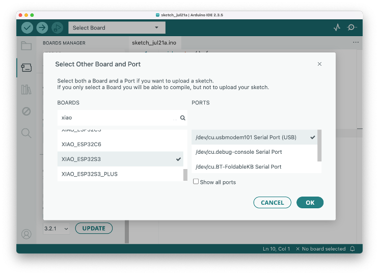 Select Board, enter with xiao or esp32s3, and select theXIAO_ESP32S3in the boards manager and the corresponding PORT where the ESP32S3 is connected.